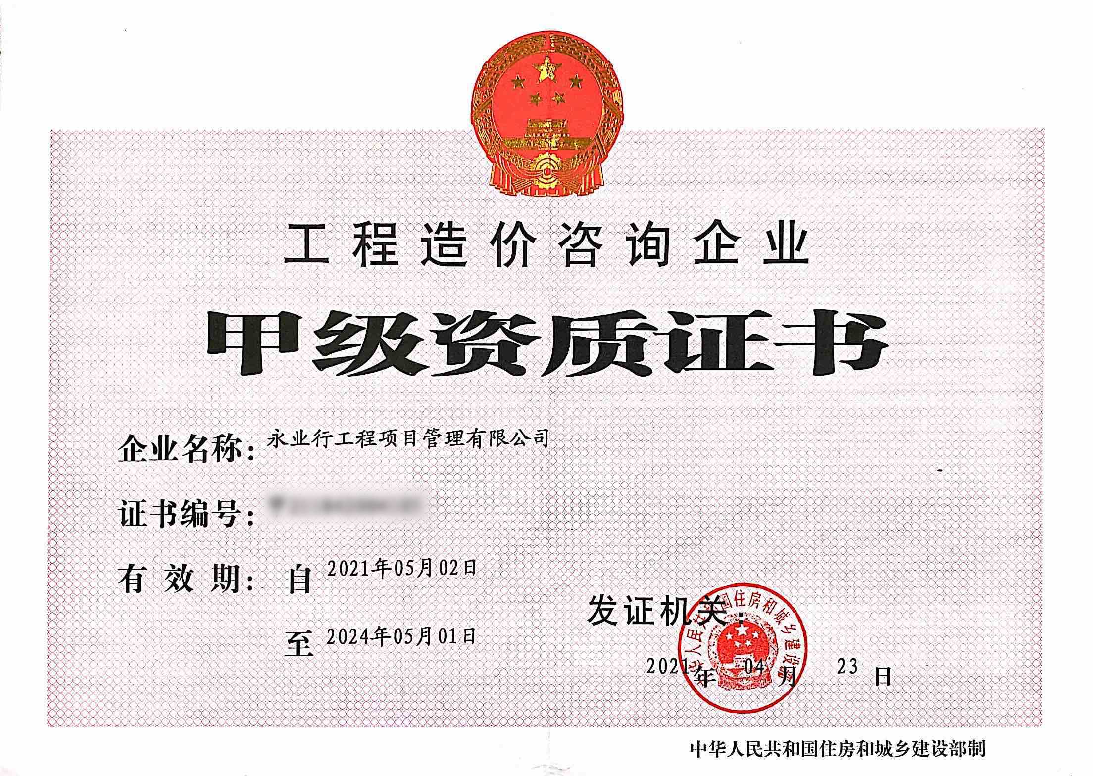 工程造价咨询企业甲级资质证书