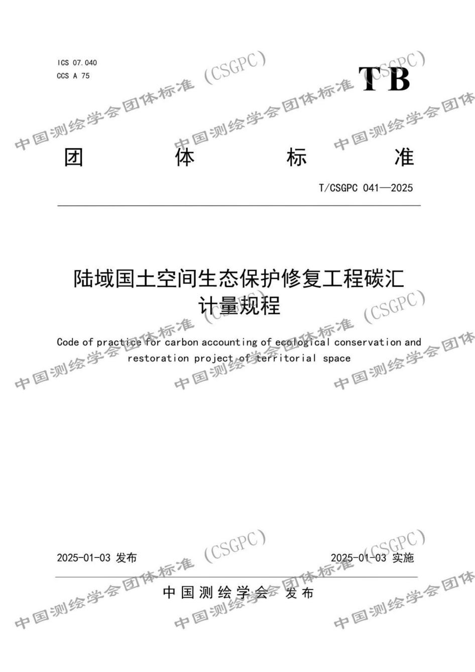 近日,中国测绘学会发布了《陆域国土空间生态保护修复工程碳汇计量规程》(T/CSGPC 041-2025)CSGPC标准(简称《规程》)。《规程》由武汉市测绘研究院牵头,中国测绘科学研究院、北京市测绘设计研究院、湖北省林业科学研究院、中国科学院生态环境研究中心、自然资源部测绘标准化研究所、武汉大学、湖北省地质调查院、永业行等单位共同编制。《规程》为首个针对国土空间生态保护修复工程的碳汇计量团体标准。
